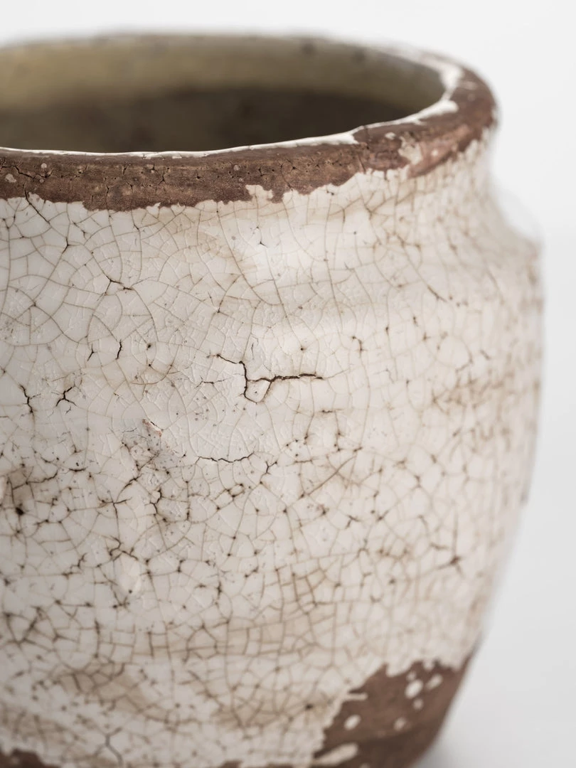 Small rustic terracotta plant pot with a cream crackle finish. Full of interest and character, each one varying in finish.