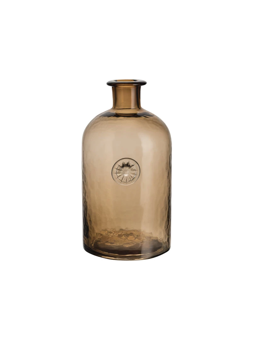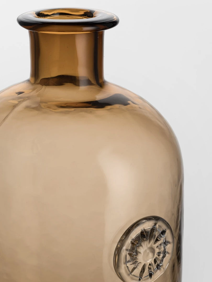 Hand blown apocethary style brown vase with flower emblem – add just one stem for a stylish display.