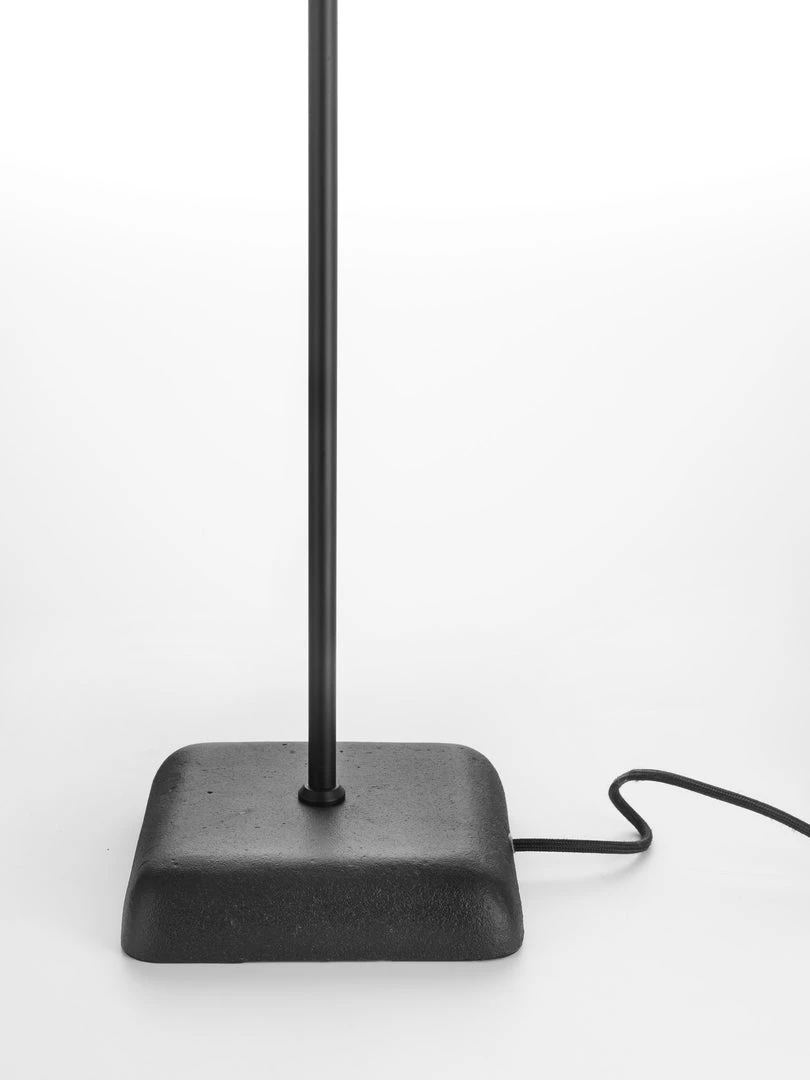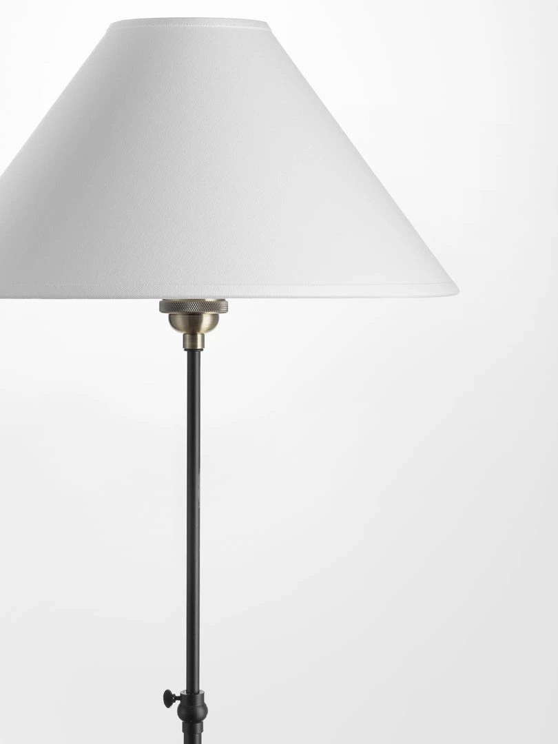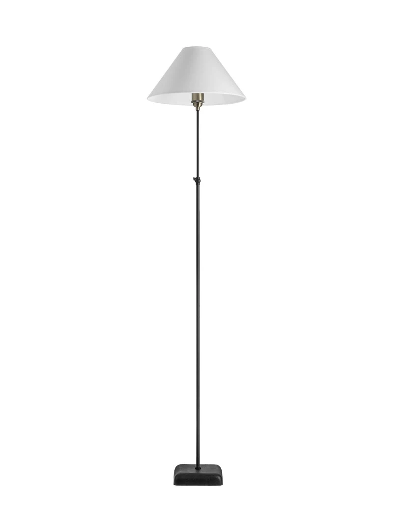 Tall black metal floor lamp topped with a crisp white coolie shade, includes a floor dimmer switch to create the perfect ambience.