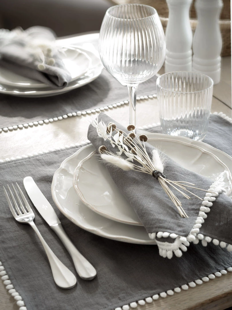 Set off the perfect dinner with our hand-made bobble placemats made from 100% European flax. Each napkin finished with pure white bobbles around the edge. Decadent, versatile and function.