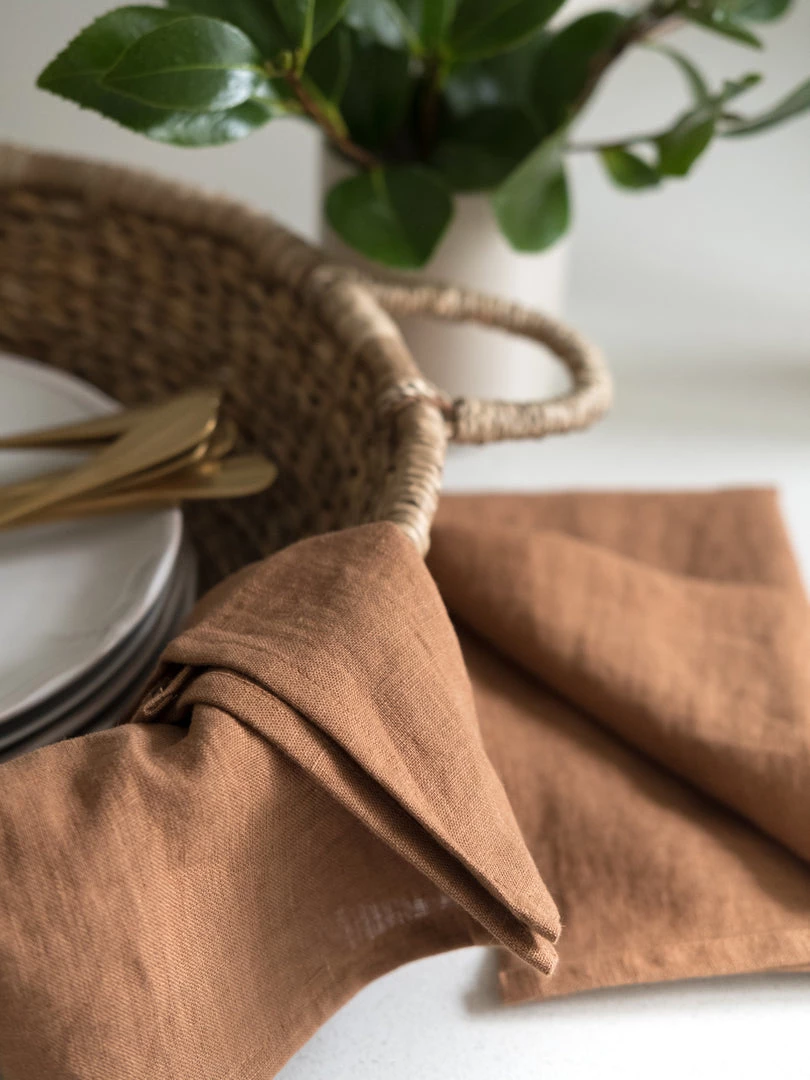 Made from 100% linen in Europe, these beautifully soft cinnamon linen napkins are warm and inviting giving a formal yet inviting feel to your table.