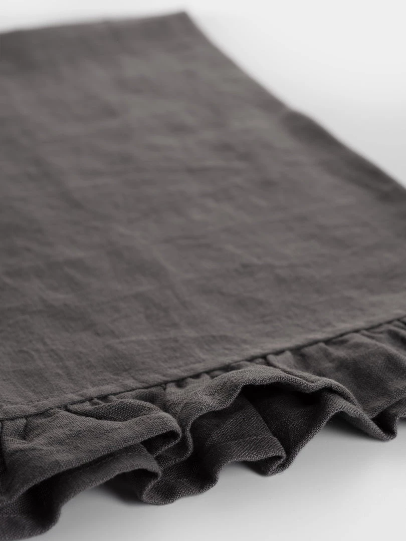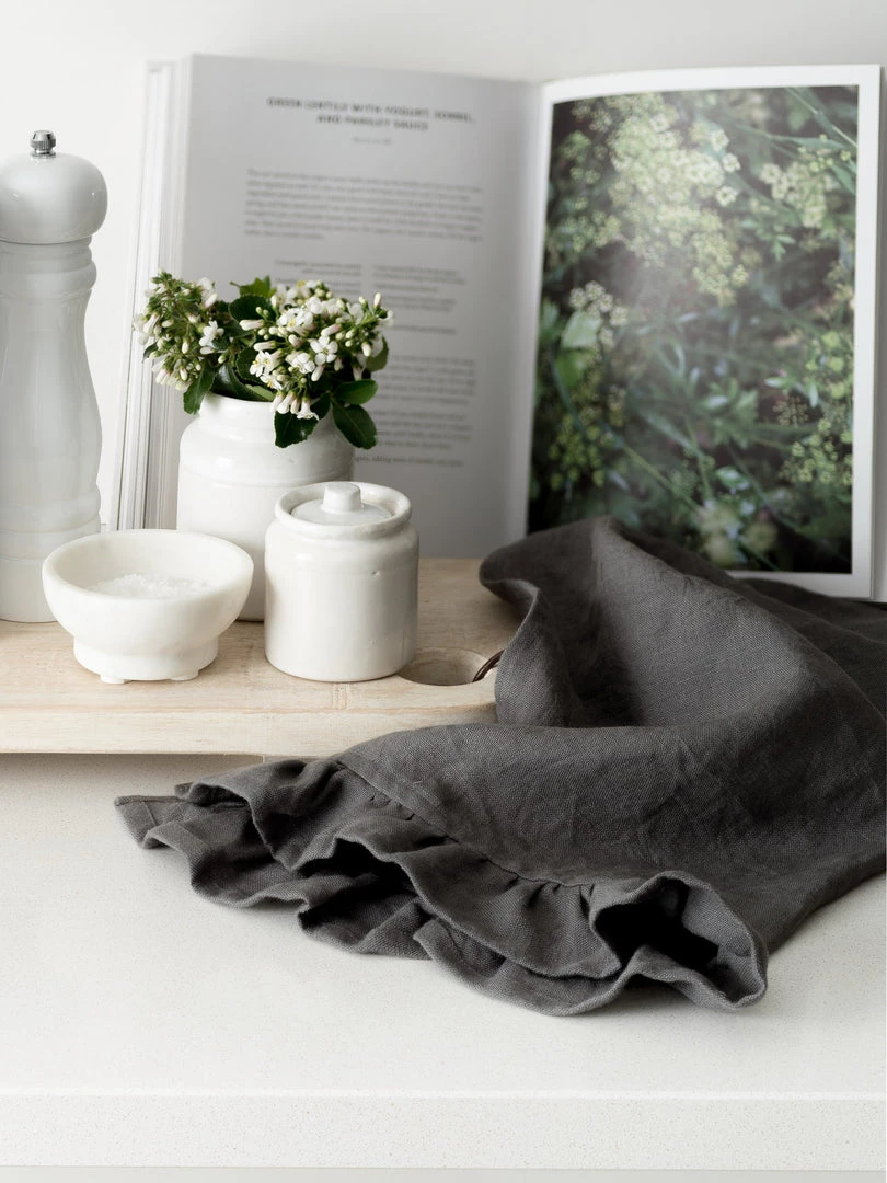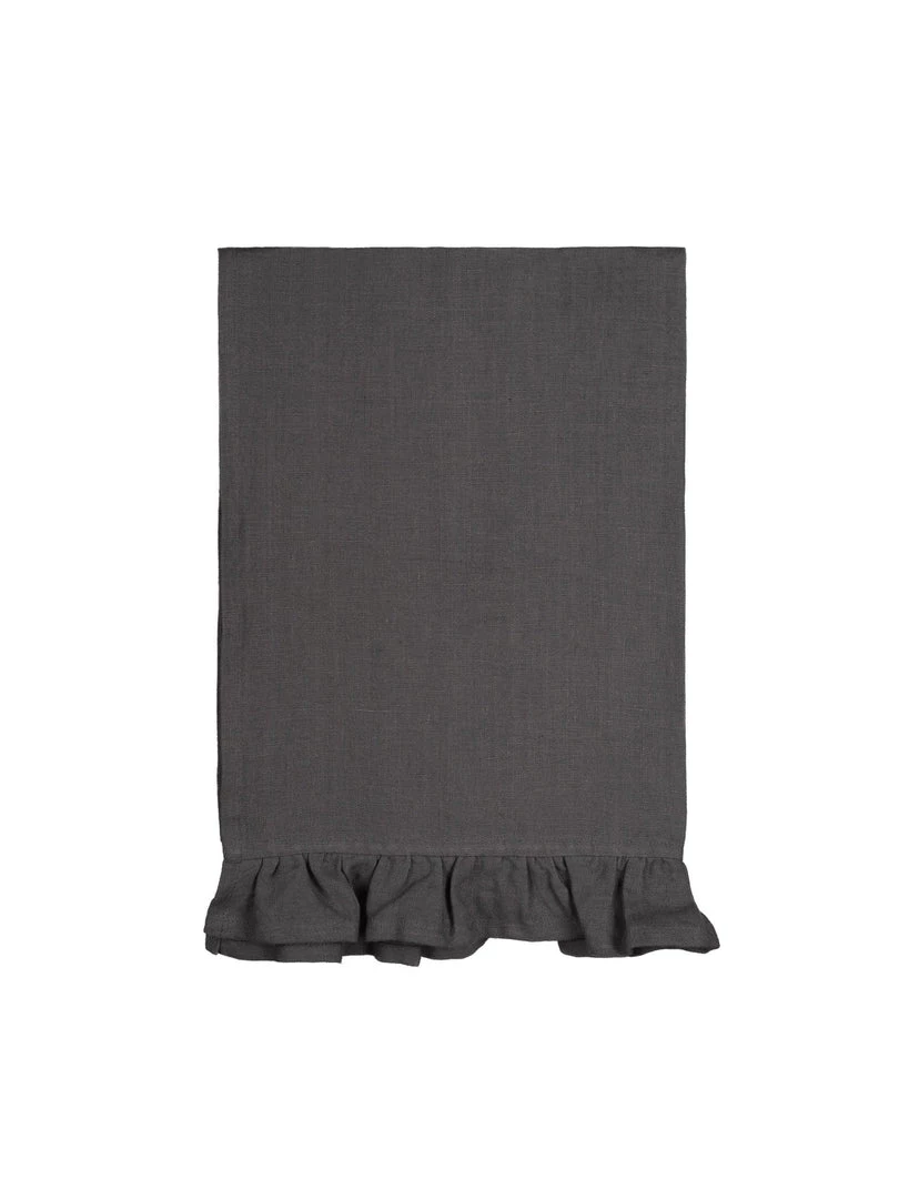 Charcoal grey tea towel, the perfect neutral to go in any kitchen, set off with ruffled detailing on one side.