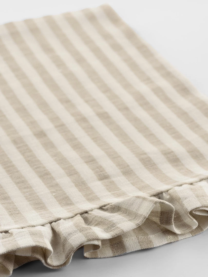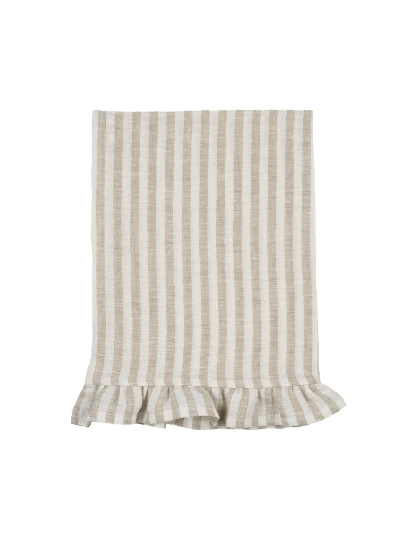 Beige/natural striped linen tea towel, something unique for the kitchen, set off with ruffled detailing on one side. Finished with a loop for hanging.