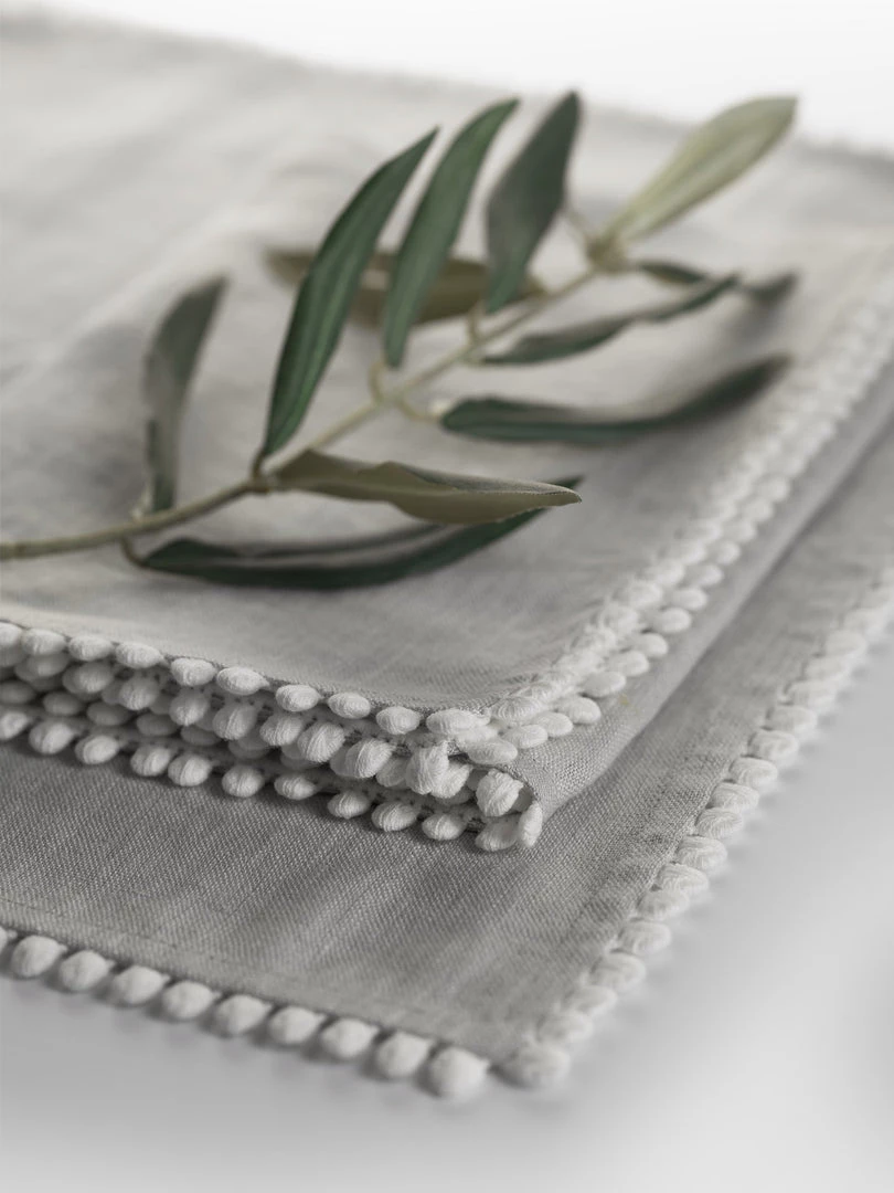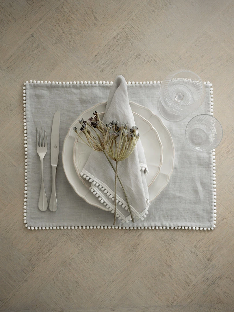 Set off the perfect dinner with our hand-made bobble placemats made from 100% European flax. Each napkin finished with pure white bobbles around the edge. Decadent, versatile and function.