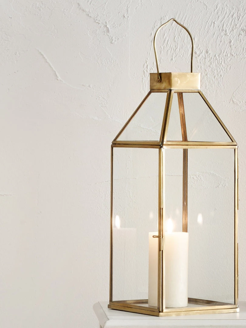 Shiny brass metal and clear glass square lantern. From special occasions to cosy evenings in, this lantern will add a welcoming atmospheric cosy glow to your room. Why not couple with our square and taller version or our black brass options to complete the look.