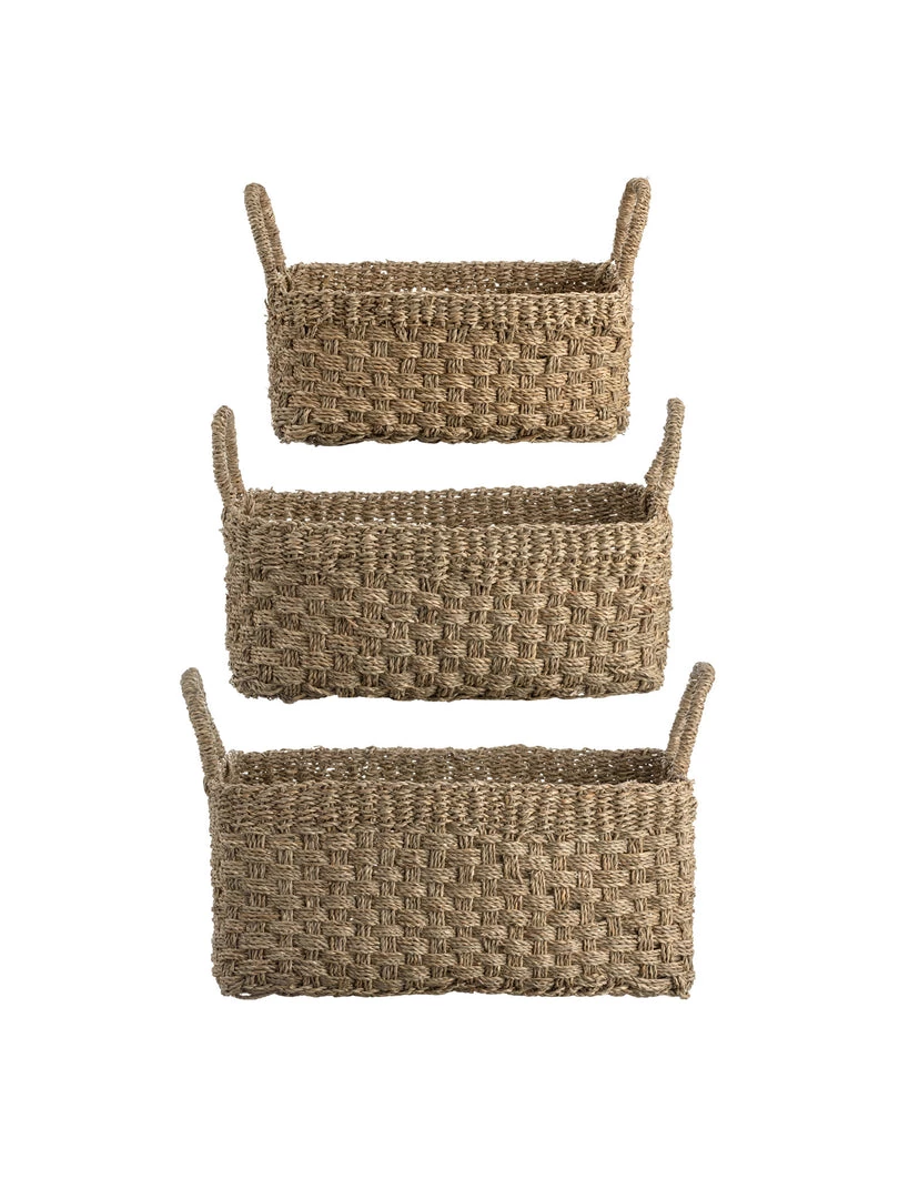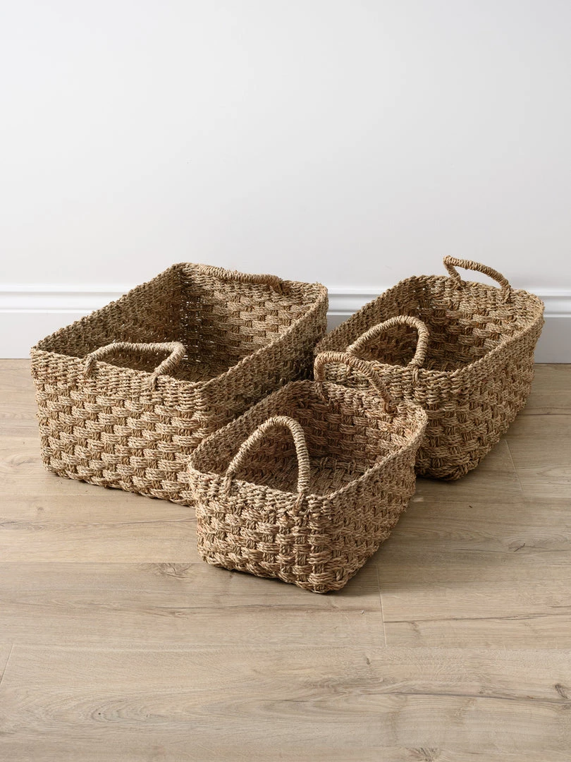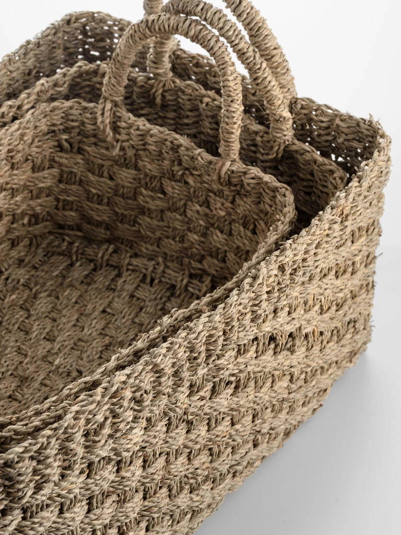 Bring a touch of rustic charm to your home with these handled, rectangular natural seagrass storage baskets. Sized so that they can be used for a multitude of storage conundrums, bathroom accessories, kitchen storage, kindling, magazines, the list is endless.
