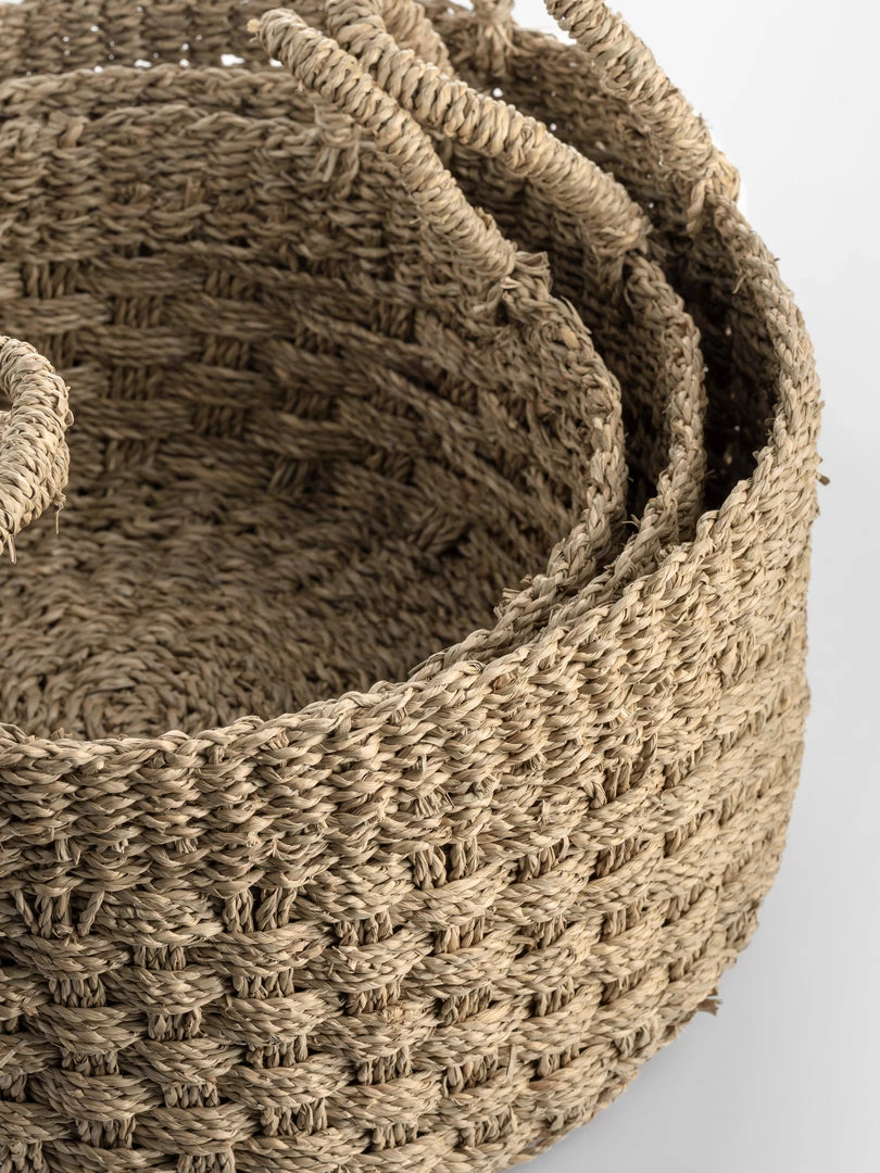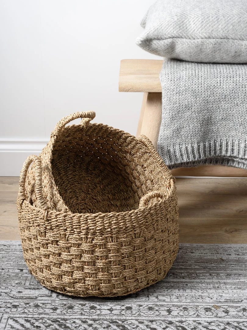Bring a touch of rustic charm to your home with these handled, round natural seagrass storage baskets. Sized so that they can be used for a multitude of storage conundrums, bathroom accessories, kitchen storage, kindling, magazines, the list is endless.