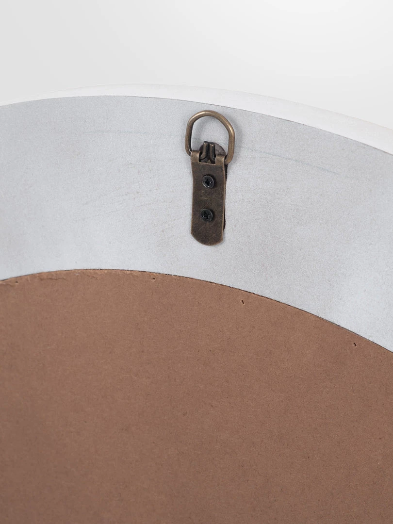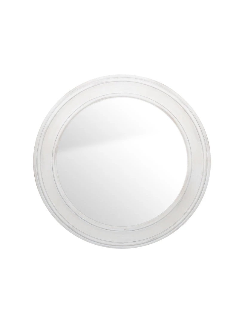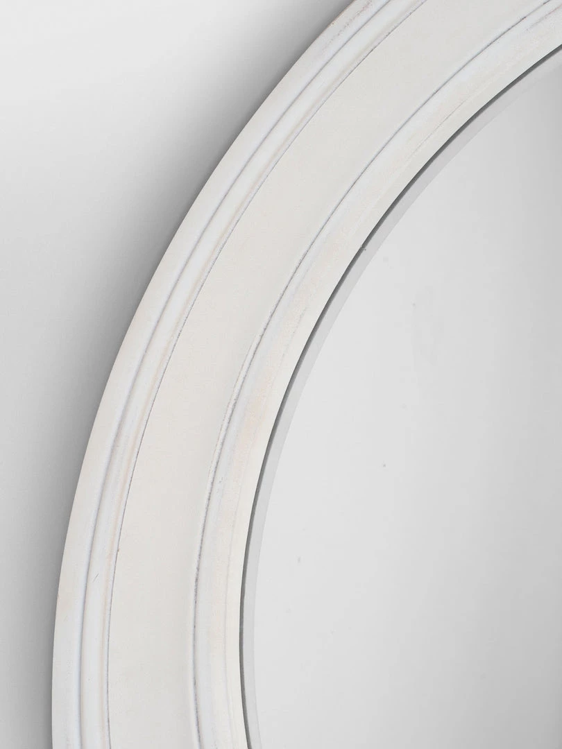 Classic round wooden mirror in a soft white with a slight distressed finish.