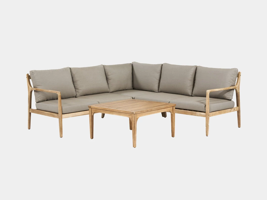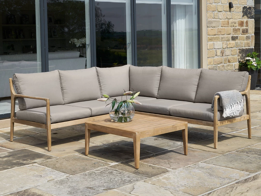 The Sardinia Corner Set will give your garden a contemporary update with its natural finish acacia wood frame and complemented with soft grey cushions.