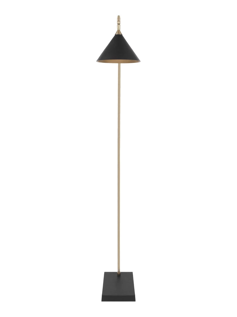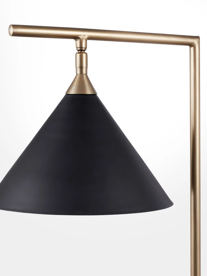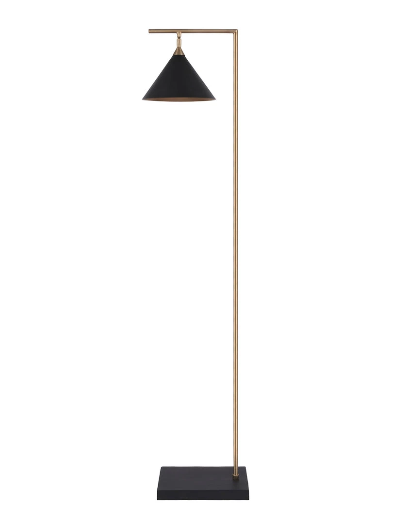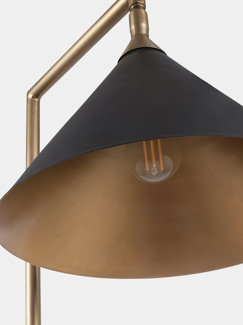 Smooth matt black base and shade with an antique brass pole. A moveable head allows for perfect positioning of the conical shade.