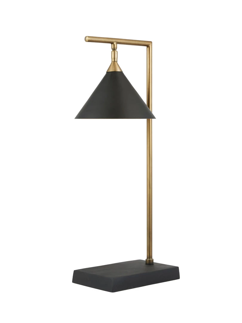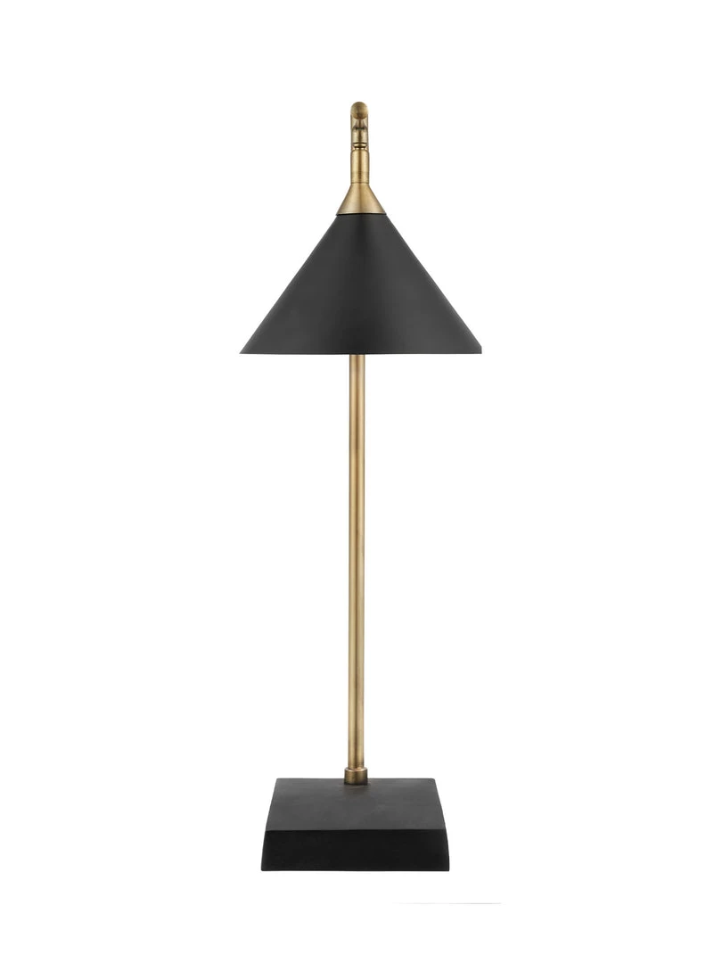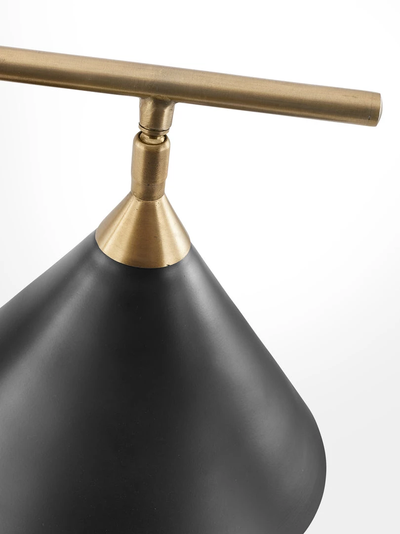 Smooth matt black base and shade with an antique brass pole. A moveable head allows for perfect positioning of the conical shade.