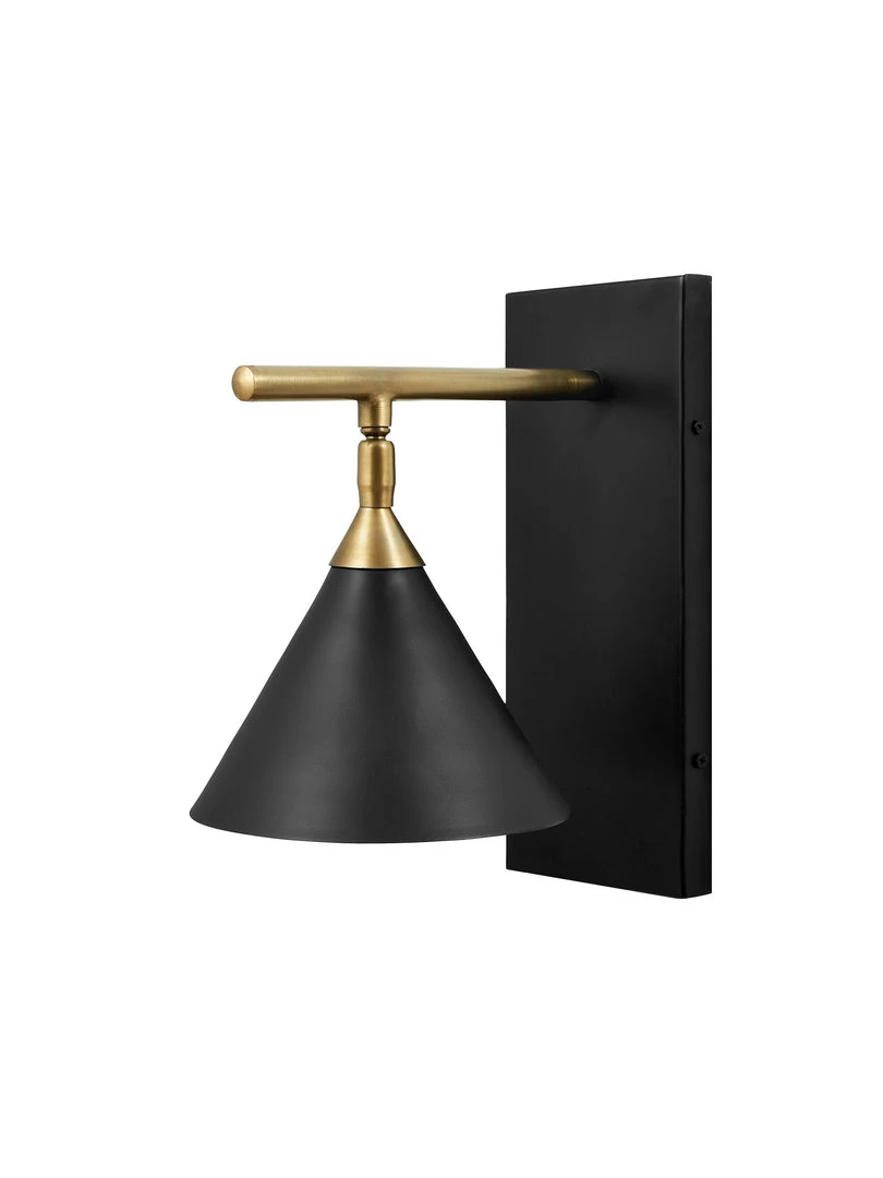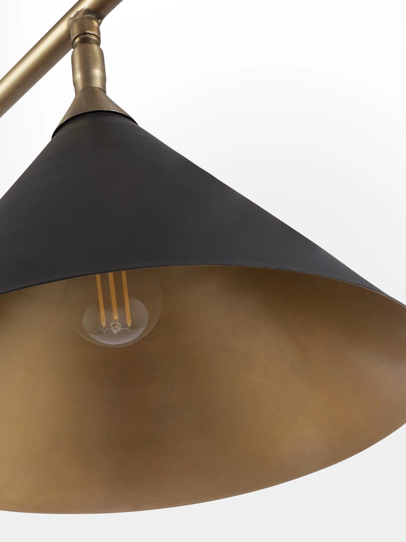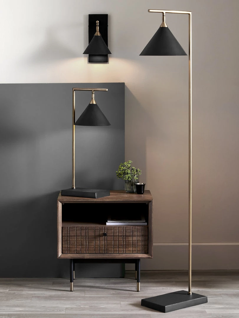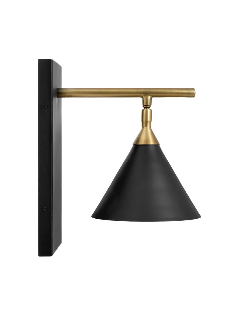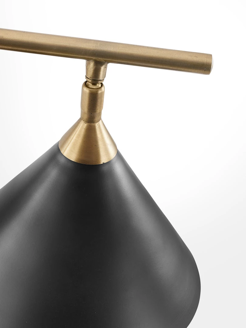 Smooth matt black base and shade with an antique brass pole. A moveable head allows for perfect positioning of the conical shade.