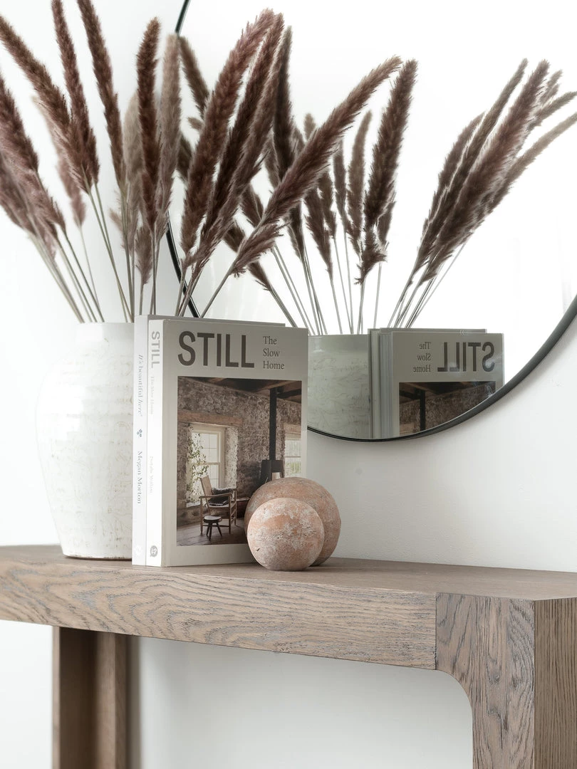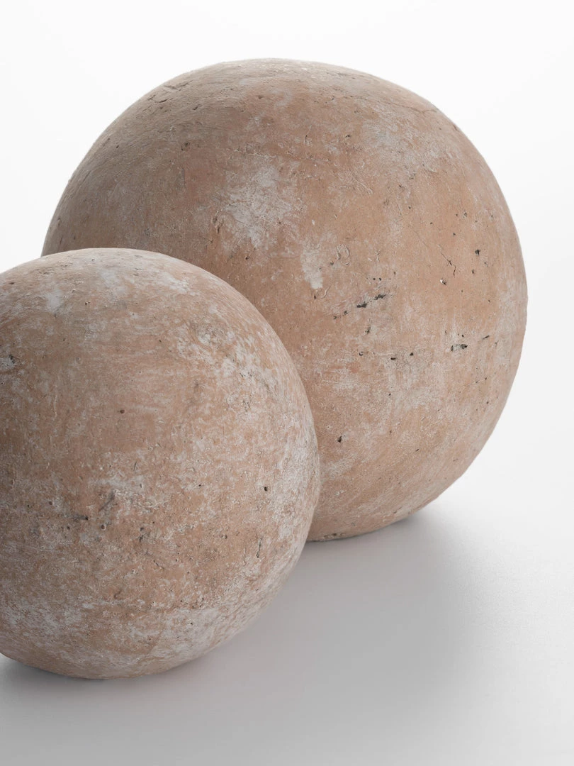 A new rustic sphere is a warm terracotta colour with distressed mottling and imperfections. Group together with the small sphere on a pile of books for an eclectic display.