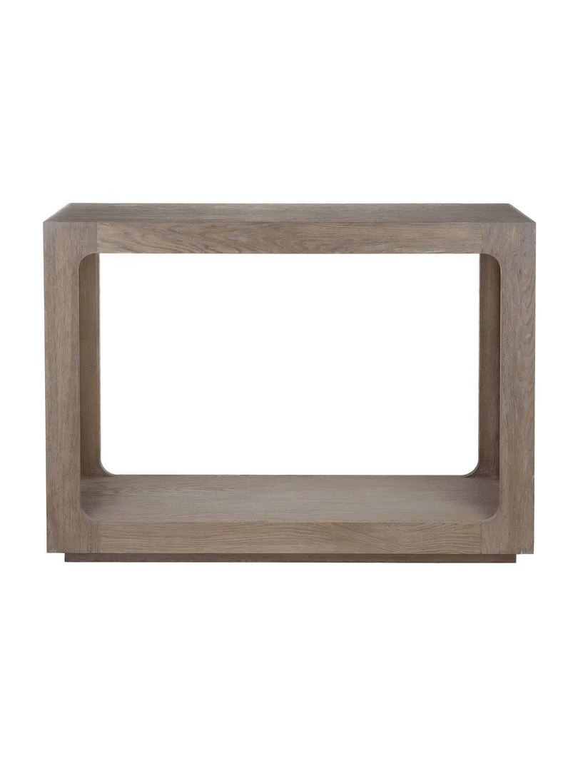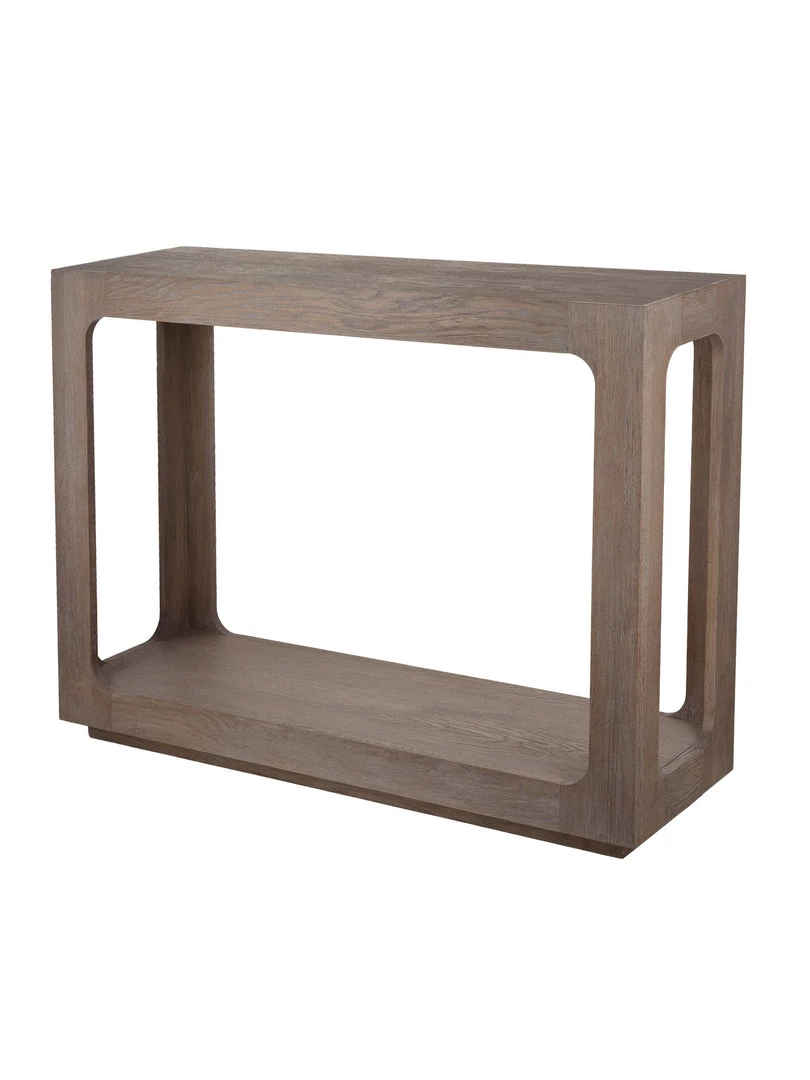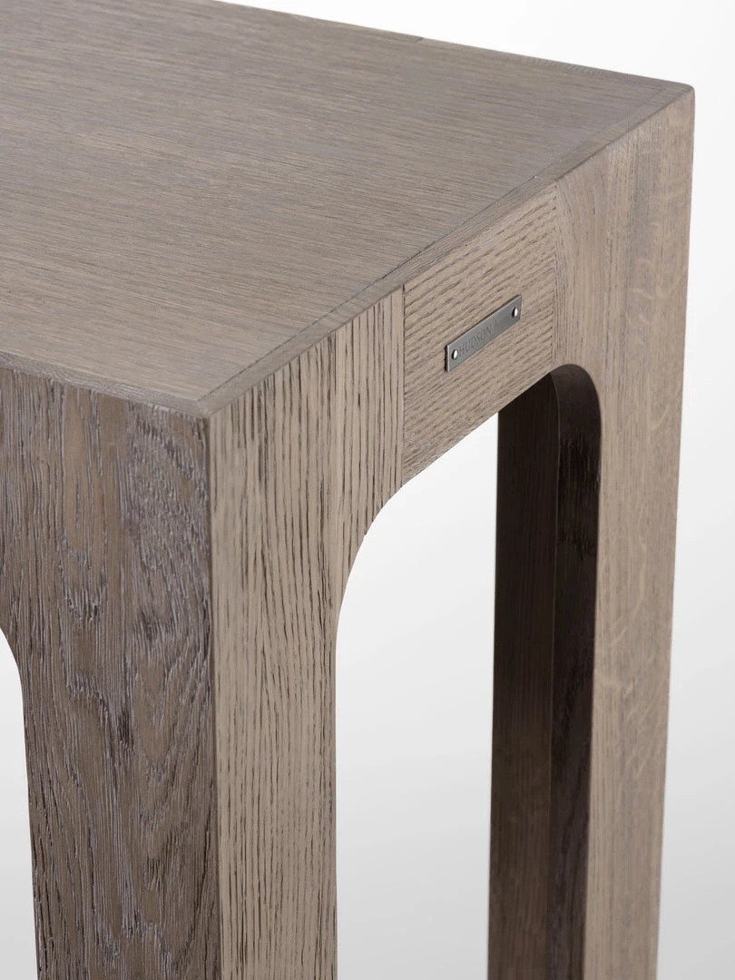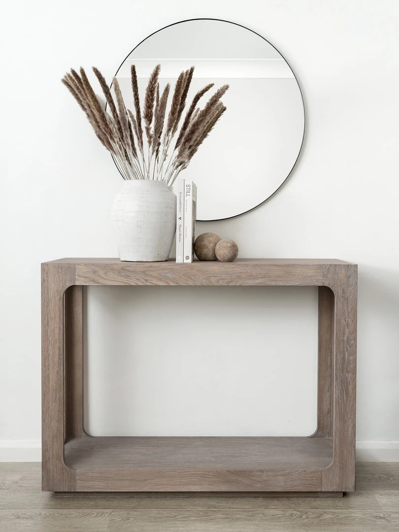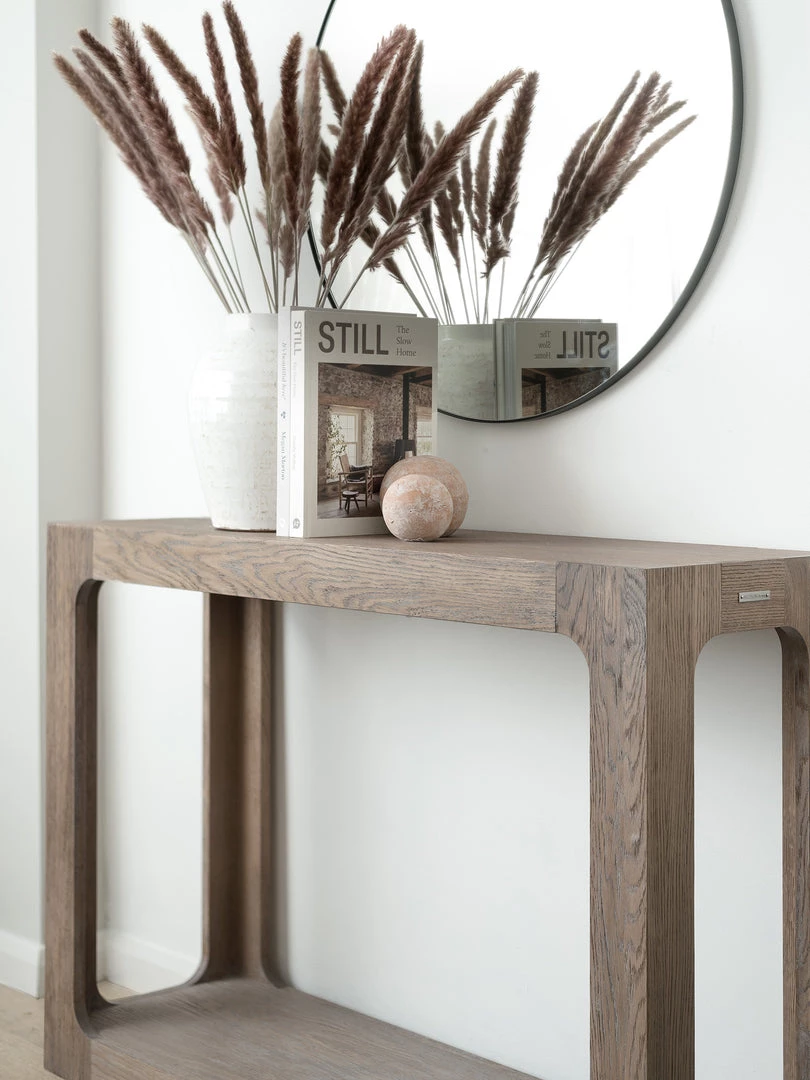 Defined by its smooth curved inner corners and a recessed plinth to subtly elevate the table, the boxy console is hand-finished in soft grey oak, epitomising the true balance of style and substance.