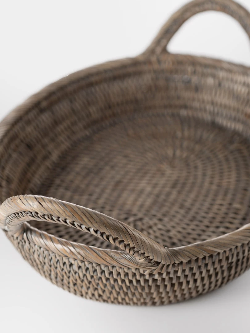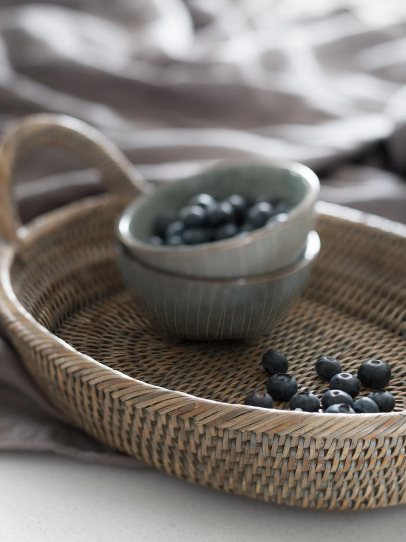 Hand-made small oval rattan tray with subtle grey finish, a versatile little tray for a simple countertop display.