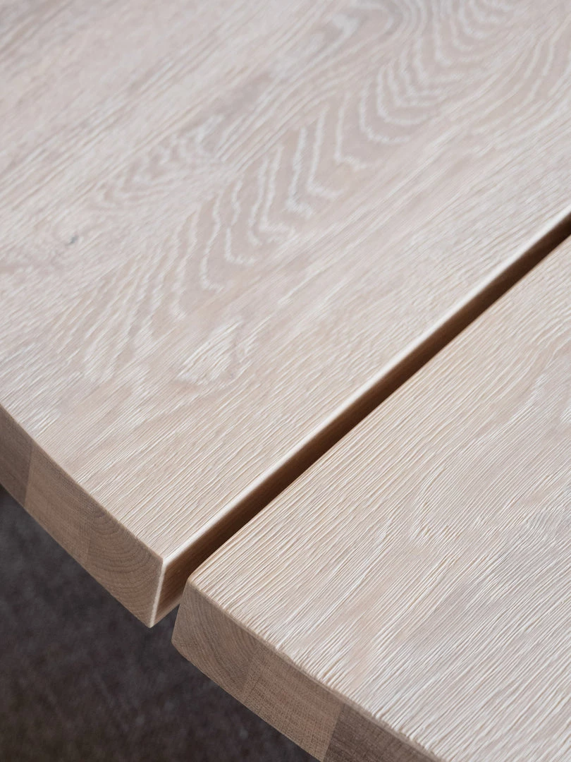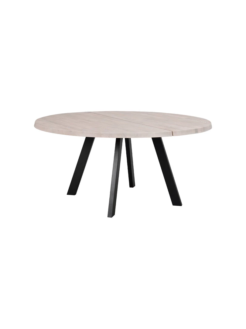 Beautiful round dining table in solid white wash coloured pigmented oak. Two-piece table top in stylish design. Legs in powder coated black metal.