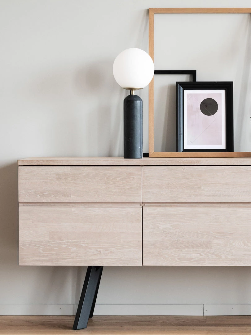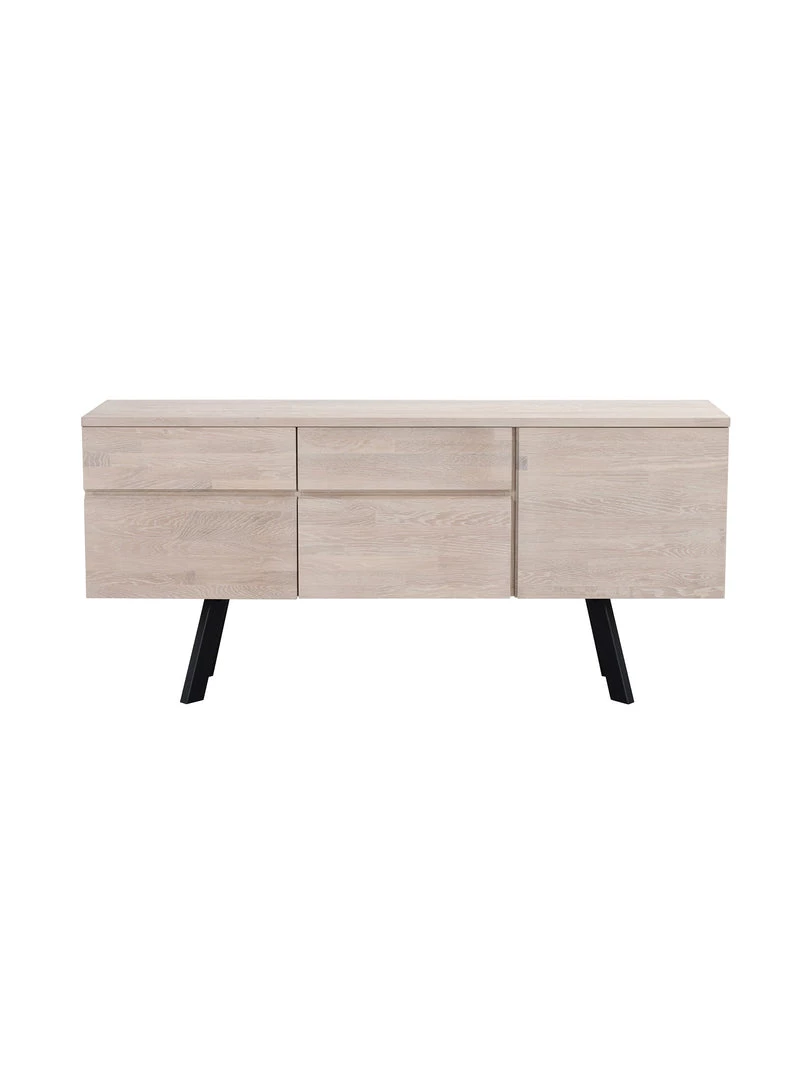 Sideboard in white pigmented coloured oak. Steel legs in powder coated black metal. Plenty of storage space in both drawers and hatches with removable shelves.