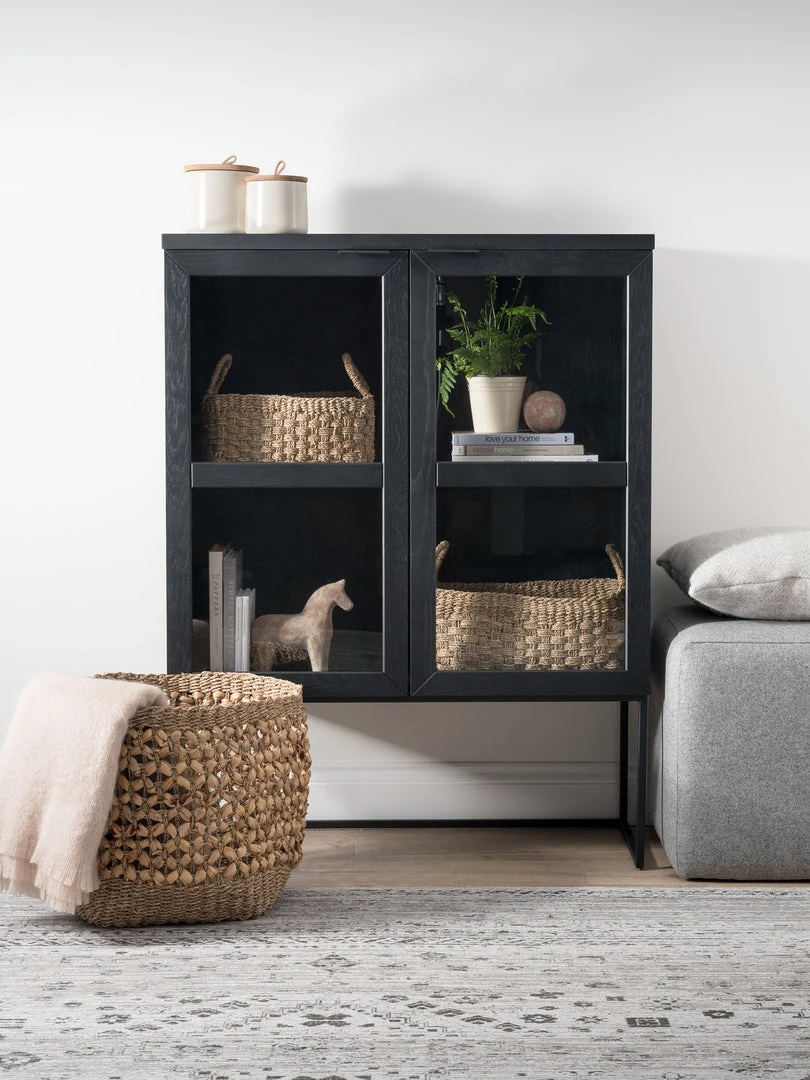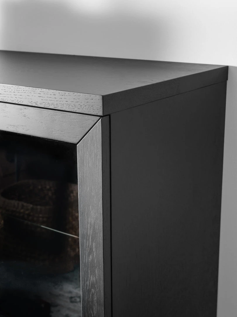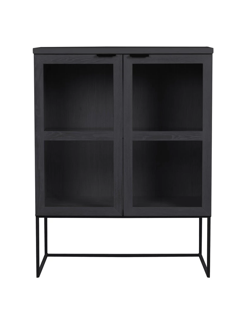 Showcase your favourite possessions with our Epsom cabinet. With glass doors and high legs, the cabinet is made of solid black lacquered oak and has a smooth surface and black legs in powder-coated metal.