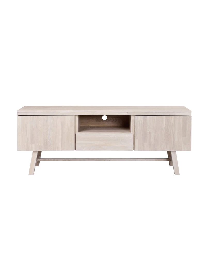 Media unit in finger-jointed solid oak with a cable hole, soft close drawers and doors.