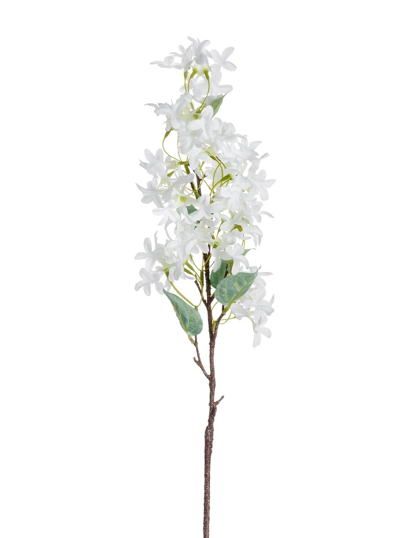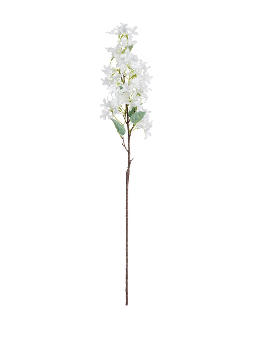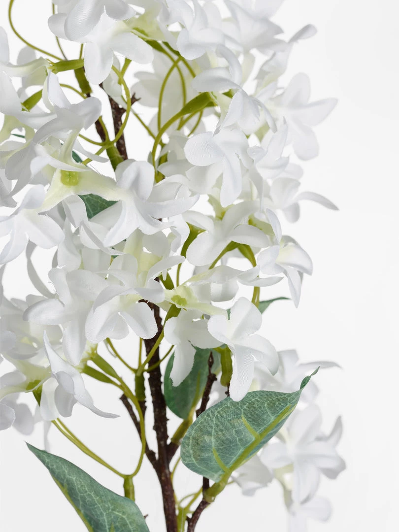 A pure white lilac faux lilac stem in full bloom. Full of delicate white flowers, on a woody brown stem, add with plain eucalyptus for a pretty summery display.