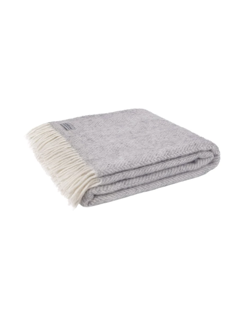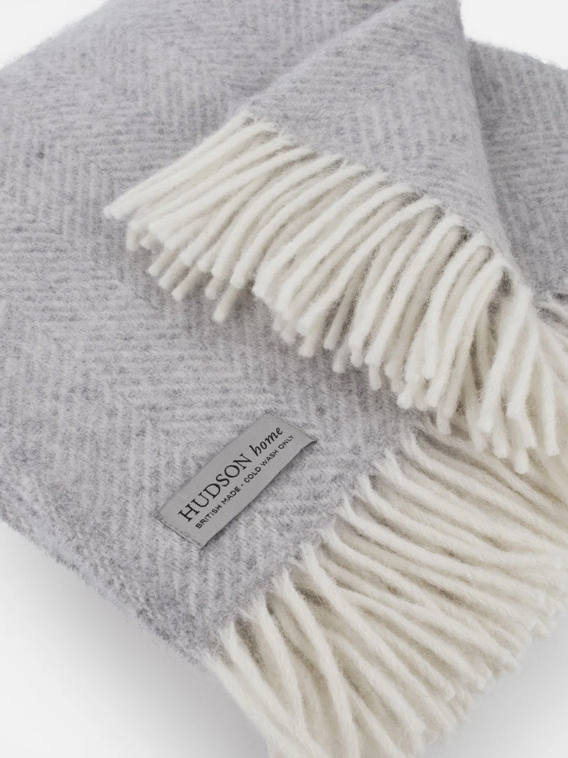 Made in the UK these throws are pure new wool. A beautiful classic herringbone design in light grey trimmed with an off white fringe, soft and cosy to snuggle under on a cold winter’s night. Adding texture and interest to a sofa or bed. Machine wash cold.