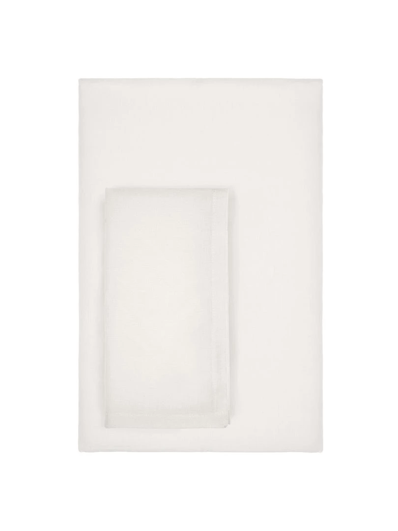 This wider width tablecloth is intricately woven in soft washed pure linen in a soft white colourway. Â
