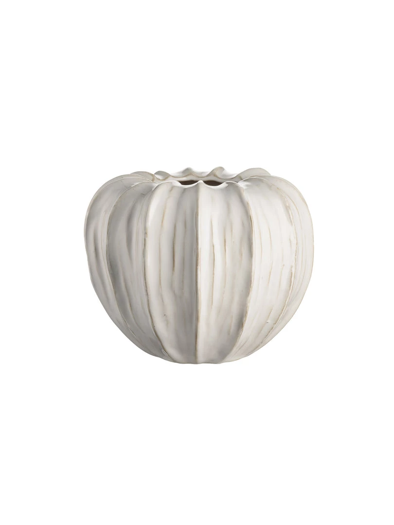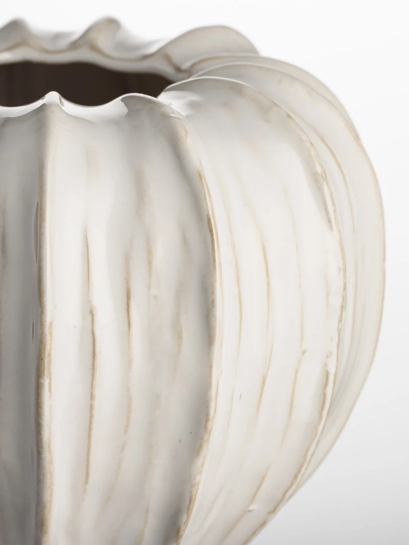 Adessa Vase in a warm white with mottled detailing and darkened ridges in taupe. This piece is eye catching and echos organic forms from nature.