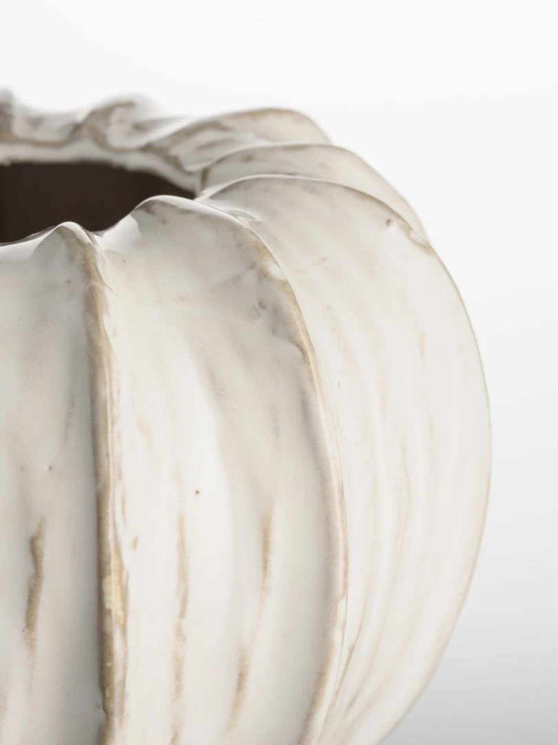 Adessa Vase in a warm white with mottled detailing and darkened ridges in taupe. This piece is eye catching and echos organic forms from nature.