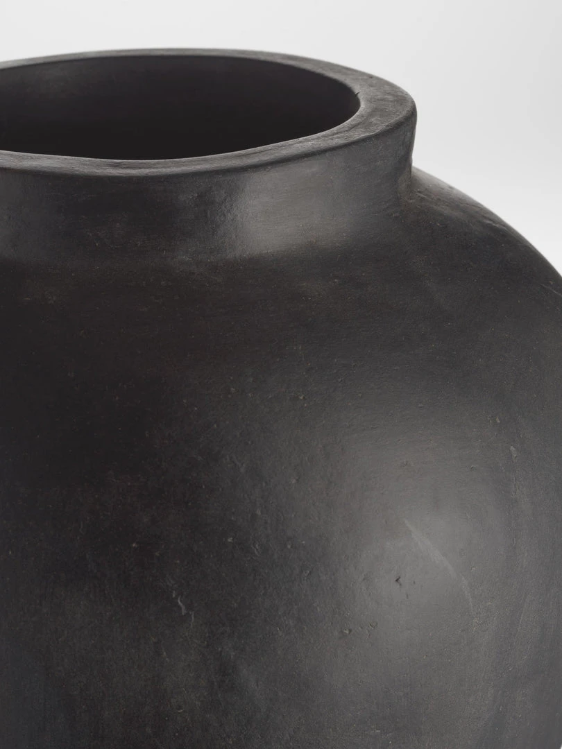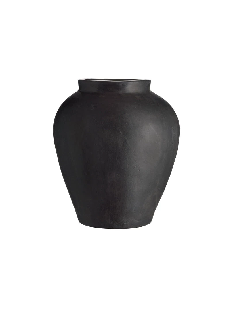 Large imposing black vase with a slightly rustic finish, fill with greens for an impactful display.