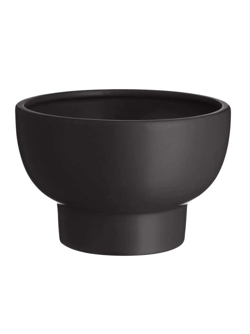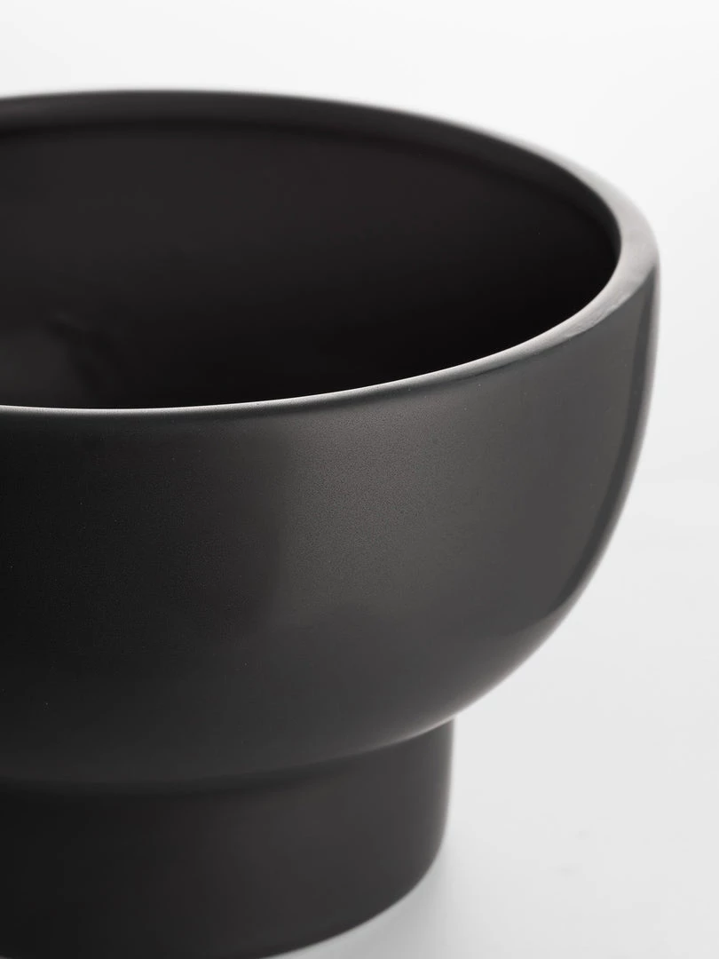 Ceramic matt black glazed pedestal bowl, smooth and tactile this bowl has a sleek silhouette, use as a planter or an alternative fruit bowl.