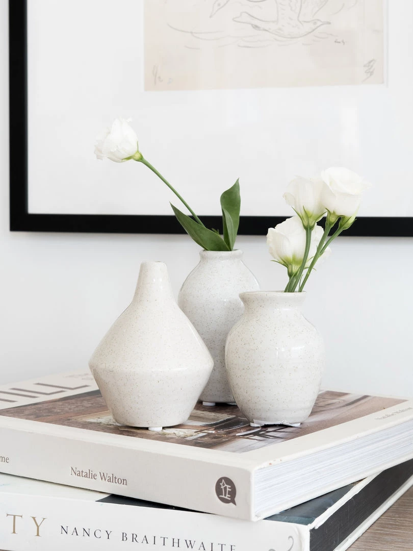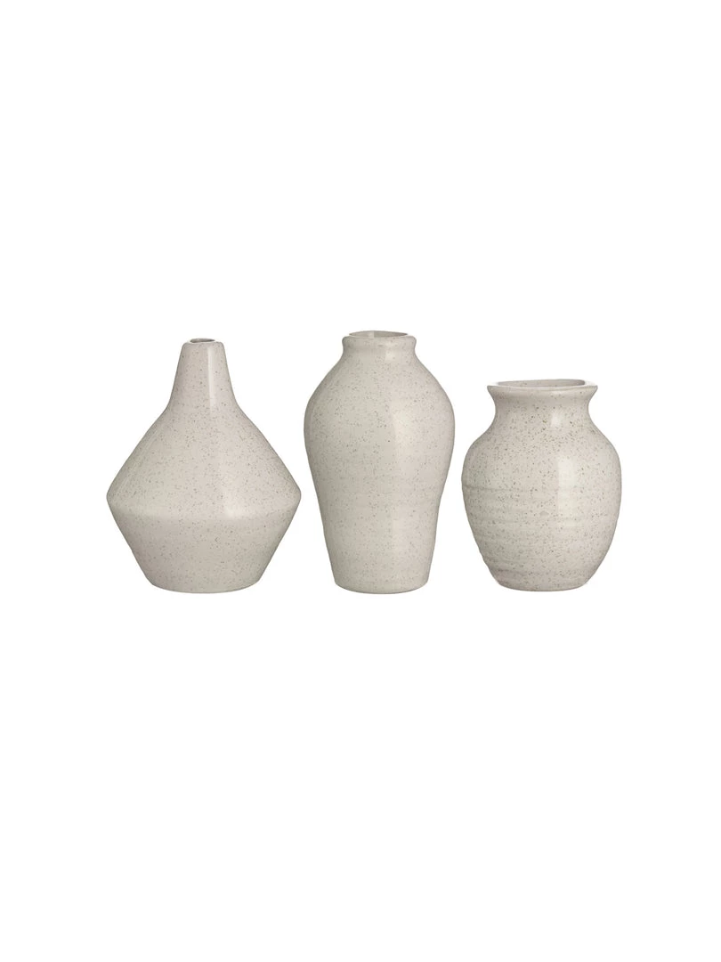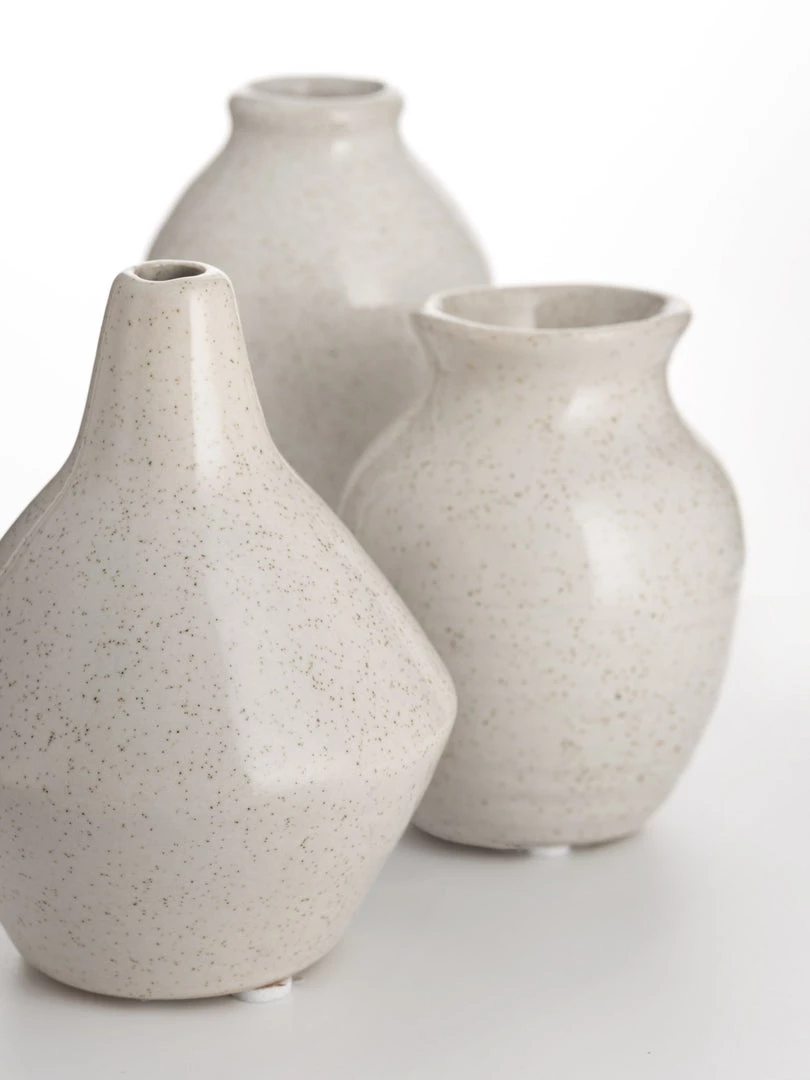 Set of three mini vases in a soft cream with a slight speckled finish. Each vase different in shape, group together or dot around your home.