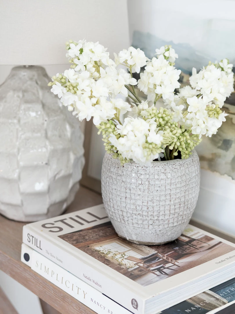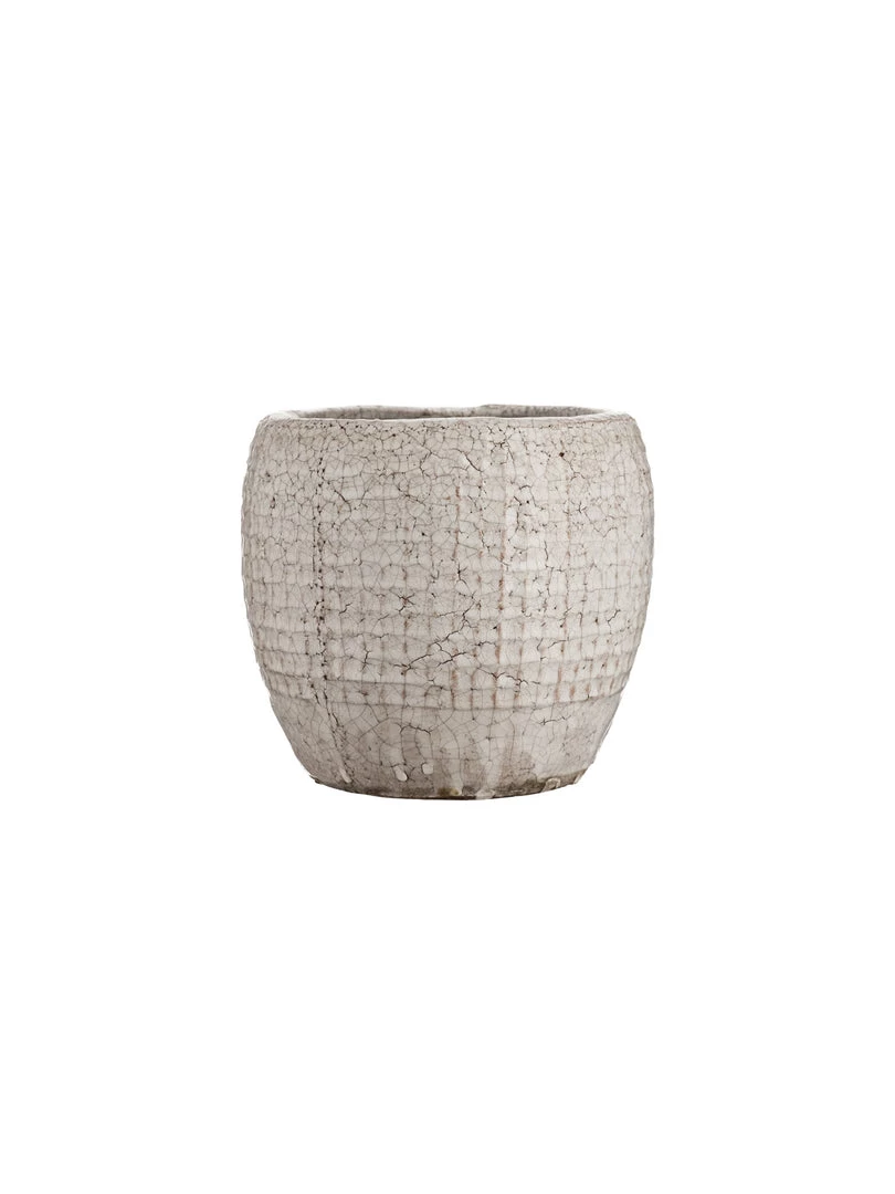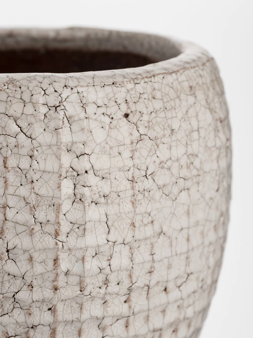 Off white crackle glaze plant pot with a cross hatch design, soft and neutral. Pretty enough as a feature on it’s own.