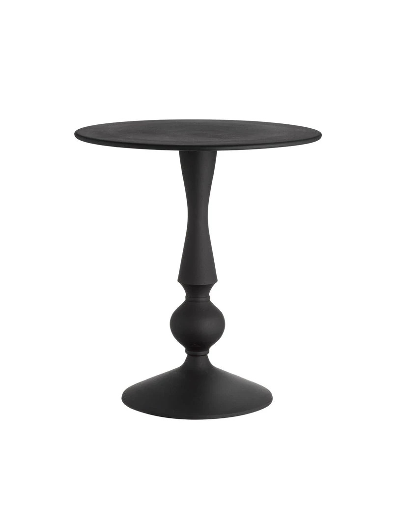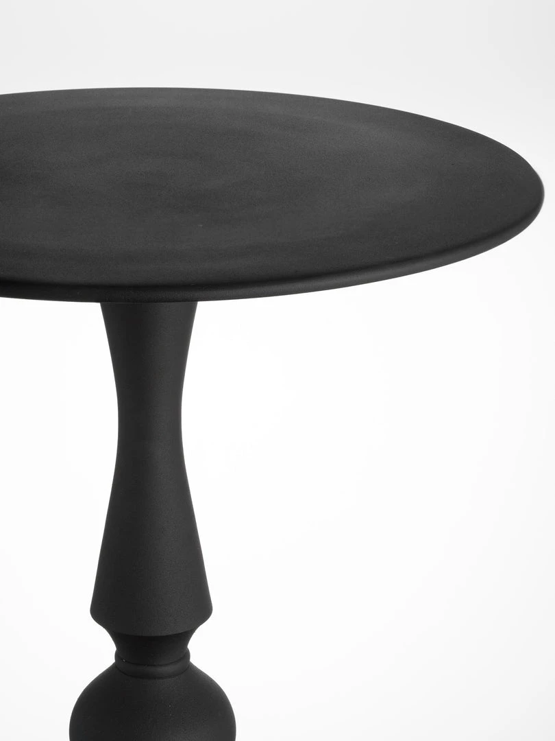 Small and useful black metal table, curved pedestal base and a flat top.