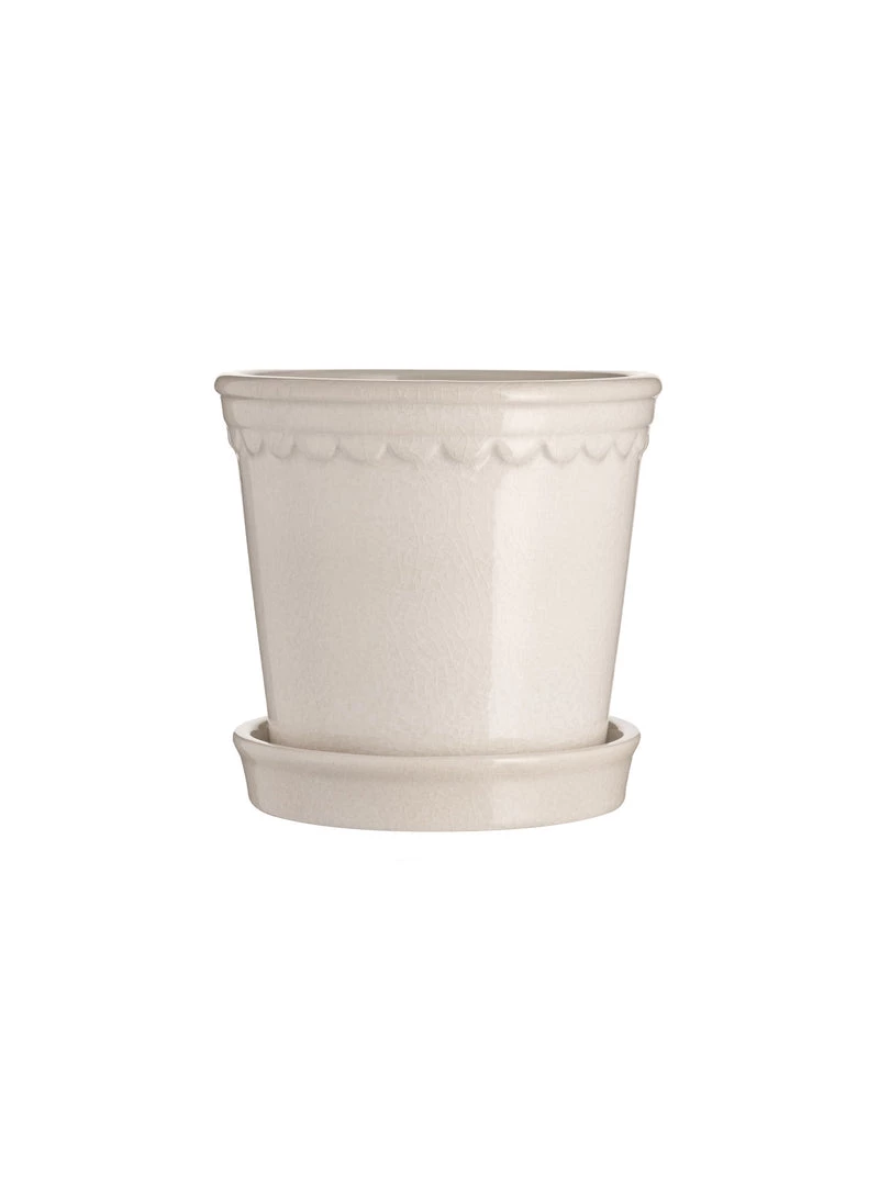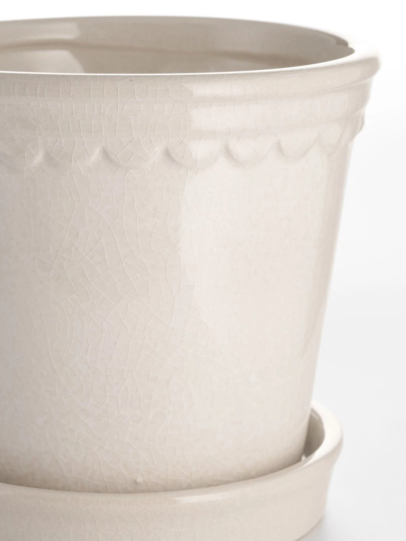 Large off-white melange plant pot with a scalloped detail around the edge, each one has a crackle glaze finish and comes with its own saucer.