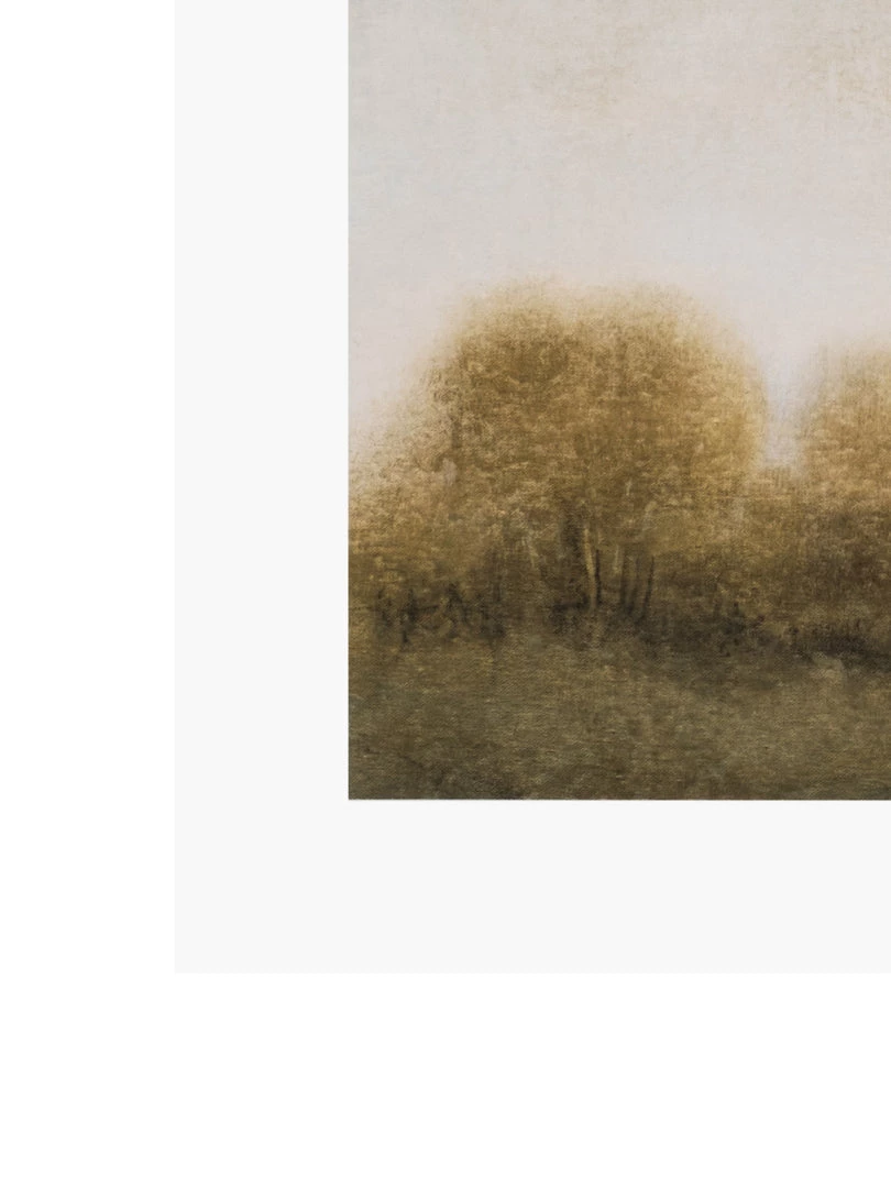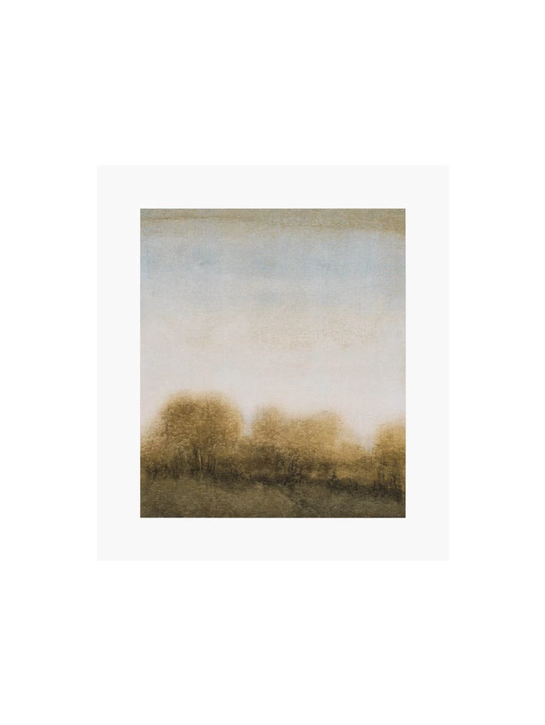 Art print of a sunset forest scene, in tones of gold, brown and soft blue