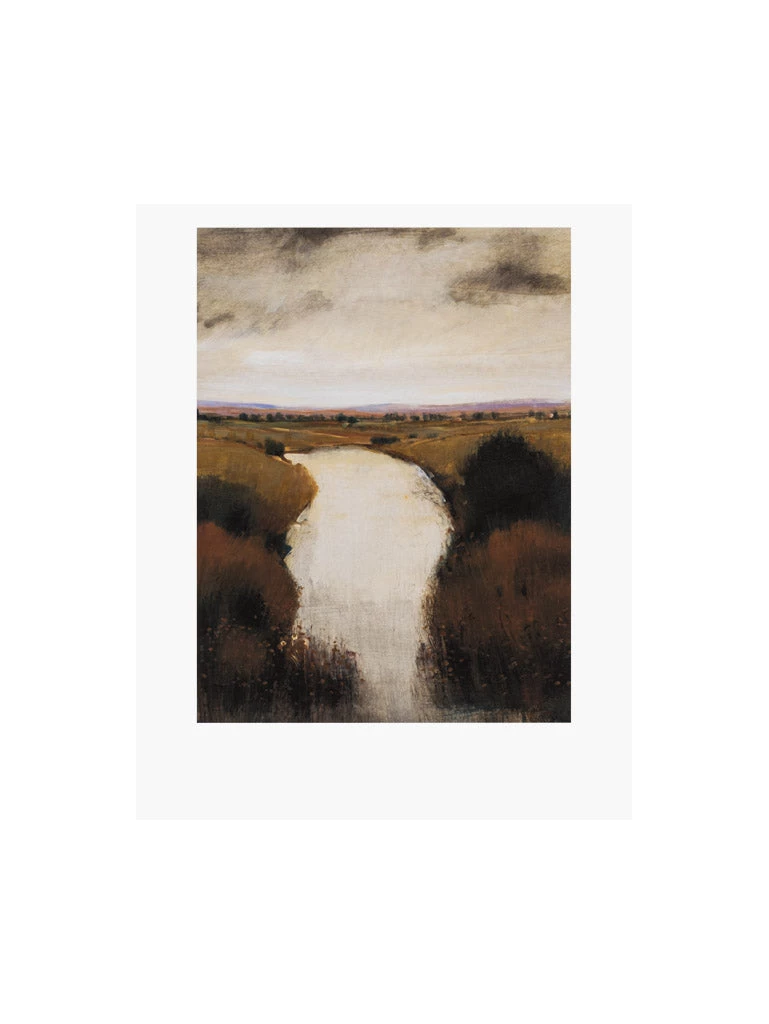 Art print of a river landscape in muted tones of ochre and brown.